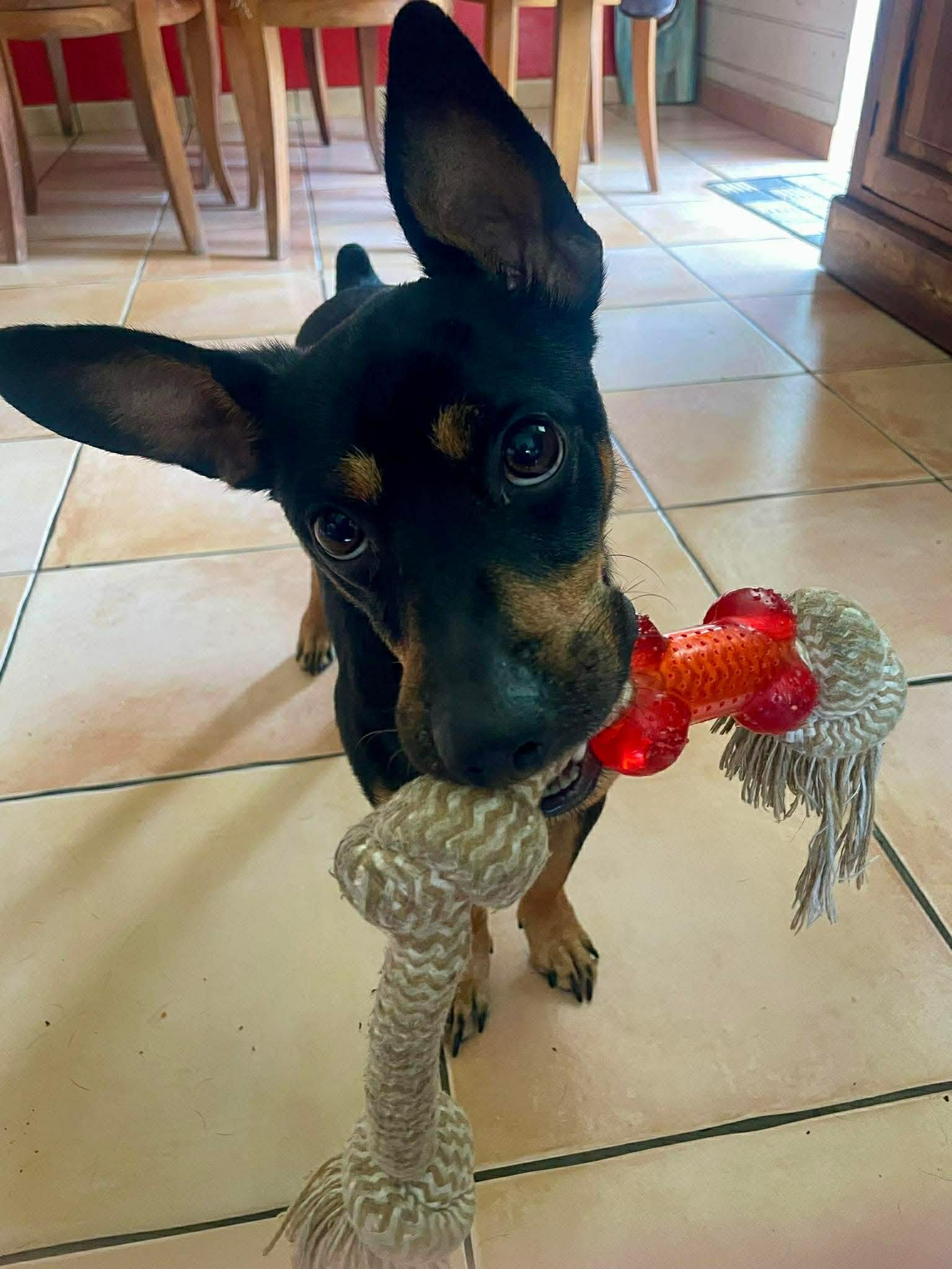 Il aime jouer, même s’il peut parfois s’exciter un peu trop et mordiller, ce qui met fin au jeu. Avec les humains, Quicky est très sociable et pas du tout timide.